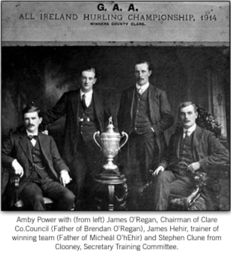 Amby Power was the captain of the Clare senior hurling team in 1914, 1915, and 1916, leading the county to its first All-Ireland senior title in 1914 when they beat Laois in the final on a scoreline of 5-1 to 1-0. The game was played in Croke Park in October, 1914 before 15,000 spectators.Amby Power was born in 1887 in Brook Lodge, close to the parish boundary with Tulla. Two of his brothers, Joe and Fred, also played with the Clare team around this period. Amby married Katie Reddan of Killorglin, County Kerry, who inherited a public house in Quin which was then known as Mariah Reddan’s. This public house was subsequently known as Power’s and run by the family for many years. Amby also did some farming in the locality. In later life, he became a member of Clare County Council for the Fine Gael Party and represented the Ennis Electoral Area from 1950 to 1960.