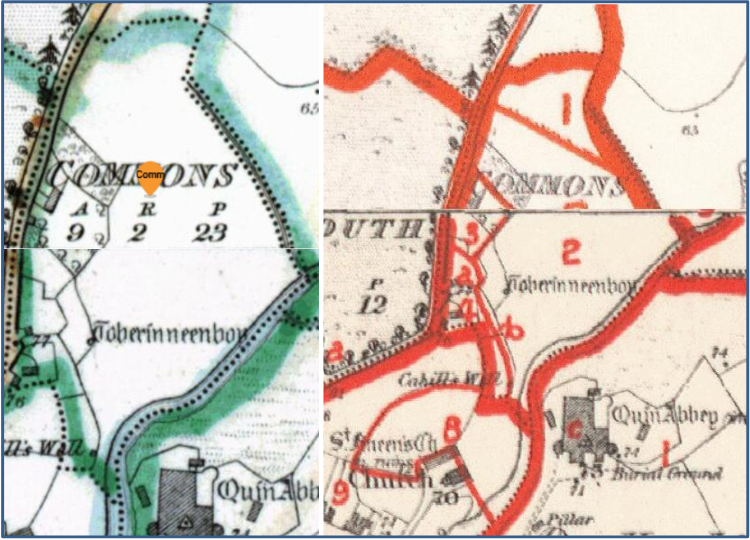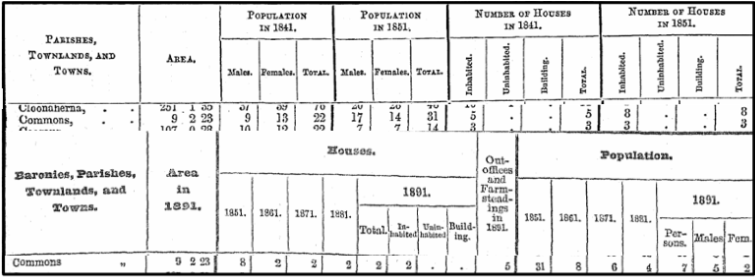 Commons townland in Quin is marginal land, liable to flooding and so today is devoid of residents, but this was not always the case. As with other townlands, the population here increased immediately following the famine but dropped sharply for each 10-year return thereafter as emigration took a hold of the younger family members.